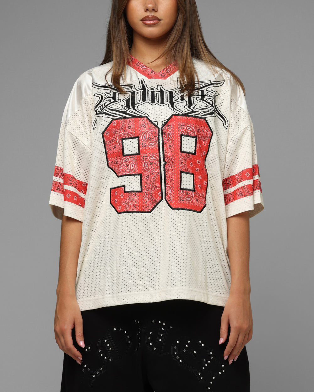 Cop the Hardcore Jersey for the perfect blend of street and sportswear. This jersey features a lightweight mesh construction, topped with a mix of embroidered and printed graphics and a ribbed v-neck for all day comfort. You don't wanna be sleeping on this one. - Printed graphics - Embroidered - Mesh construction - Ribbed v-neck - Lightweight - Twin needle stitching - Longer sleeves - Box fit - Color: Off White/Red - Style: LTQ126176