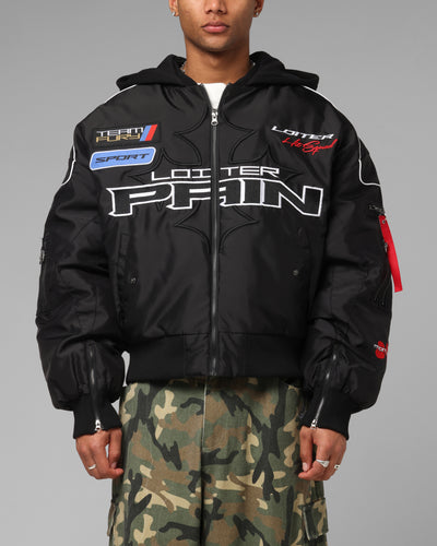 Stay warm while looking fresh and who better to heat up your wardrobe than Loiter! This jacket features striking embroidered graphics that'll get you all the compliments, ribbed cuffs and hem add a little something extra and the full zip close and quilted lining finishes off the classic varsity jacket vibe. Cop yours today at Culture Kings. - Embroidered graphics - Ribbed trims - Dropped shoulders - Quilted lining - Full zip-up close - Fleece hood - Dual side pockets - Oversized box fit - Color: Black - Style: LTQ325041