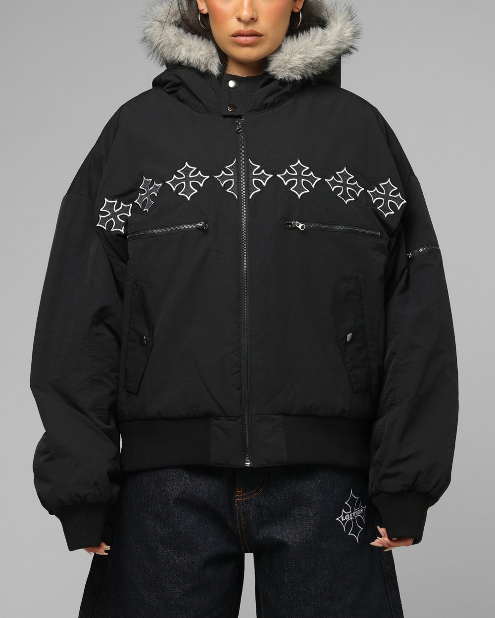 Stay warm while looking fresh and who better to heat up your wardrobe than Loiter! This jacket features embroidered graphics to the chest and faux fur hood lining for a cosy look and feel. Alongside ribbed trims and dropped shoulders for a streetwear vibe and ribbed trims to provide extra warmth. Cop yours today at Culture Kings. - Embroidered graphics - Ribbed trims - Full zip-up close - Dropped shoulders - Dual side pockets - Hood - Faux fur hood lining - Relaxed fit - Color: Black - Style: LTQ425126