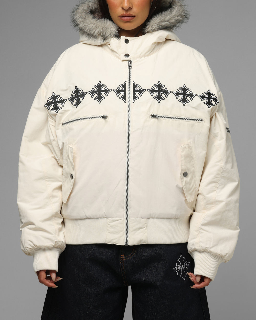 Stay warm while looking fresh and who better to heat up your wardrobe than Loiter! This jacket features embroidered graphics to the chest and faux fur hood lining for a cosy look and feel. Alongside ribbed trims and dropped shoulders for a streetwear vibe and ribbed trims to provide extra warmth. Cop yours today at Culture Kings. - Embroidered graphics - Ribbed trims - Full zip-up close - Dropped shoulders - Dual side pockets - Hood - Faux fur hood lining - Relaxed fit - Color: Off White - Style: LTQ425126
