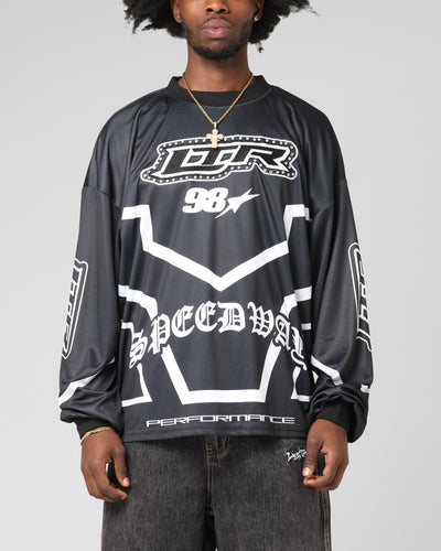 Cop the Thrill Racing Long Sleeve T-Shirt for the perfect blend of street and sportswear. This long sleeve tee features a mix of embroidered and printed graphics topped with rhinestone details for a subtle flex. Finished with ribbed crewneck and cuffs and twin needle stitching for extra reinforcement. Cop yours today at Culture Kings. - Printed graphics - Embroidered - Rhinestone details - Ribbed crewneck and cuffs - Twin needle stitching - Dropped shoulders - Long sleeves - Relaxed fit - Color: Black - Style: LTQ325013