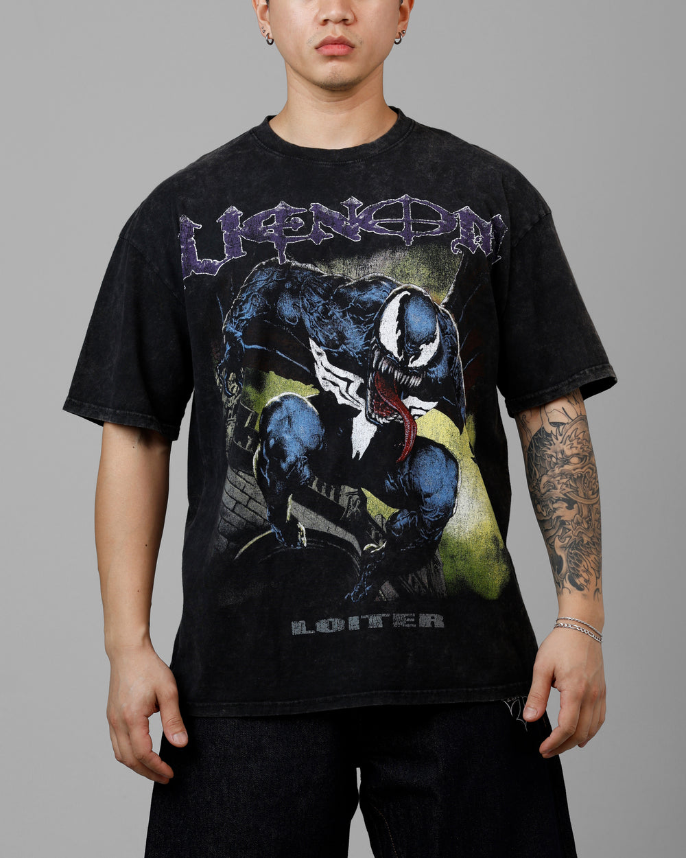 Prepare to embrace the chaos with the Marvel Venom T-Shirt. With custom printed graphics don't the front and back of this vintage washed tee. Crafted from a super soft cotton for maximum comfort, this piece was designed to move with you. Start forming your symbiotic relationship with this tee and secure yours today at Culture Kings, while stock remains. - Collaboration - Printed graphics - Dropped shoulders - Ribbed crewneck - Twin needle stitching - Regular fit - Material: 100% Cotton - Color: Black Acidwash - Style: LTVNMSNTGT